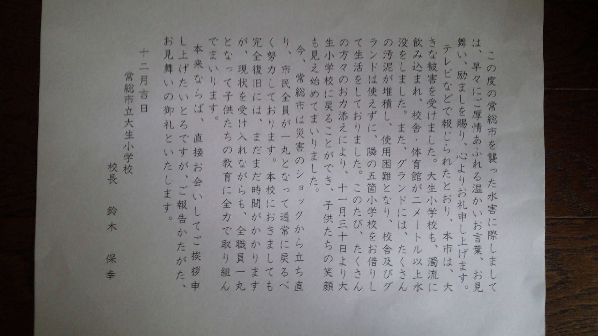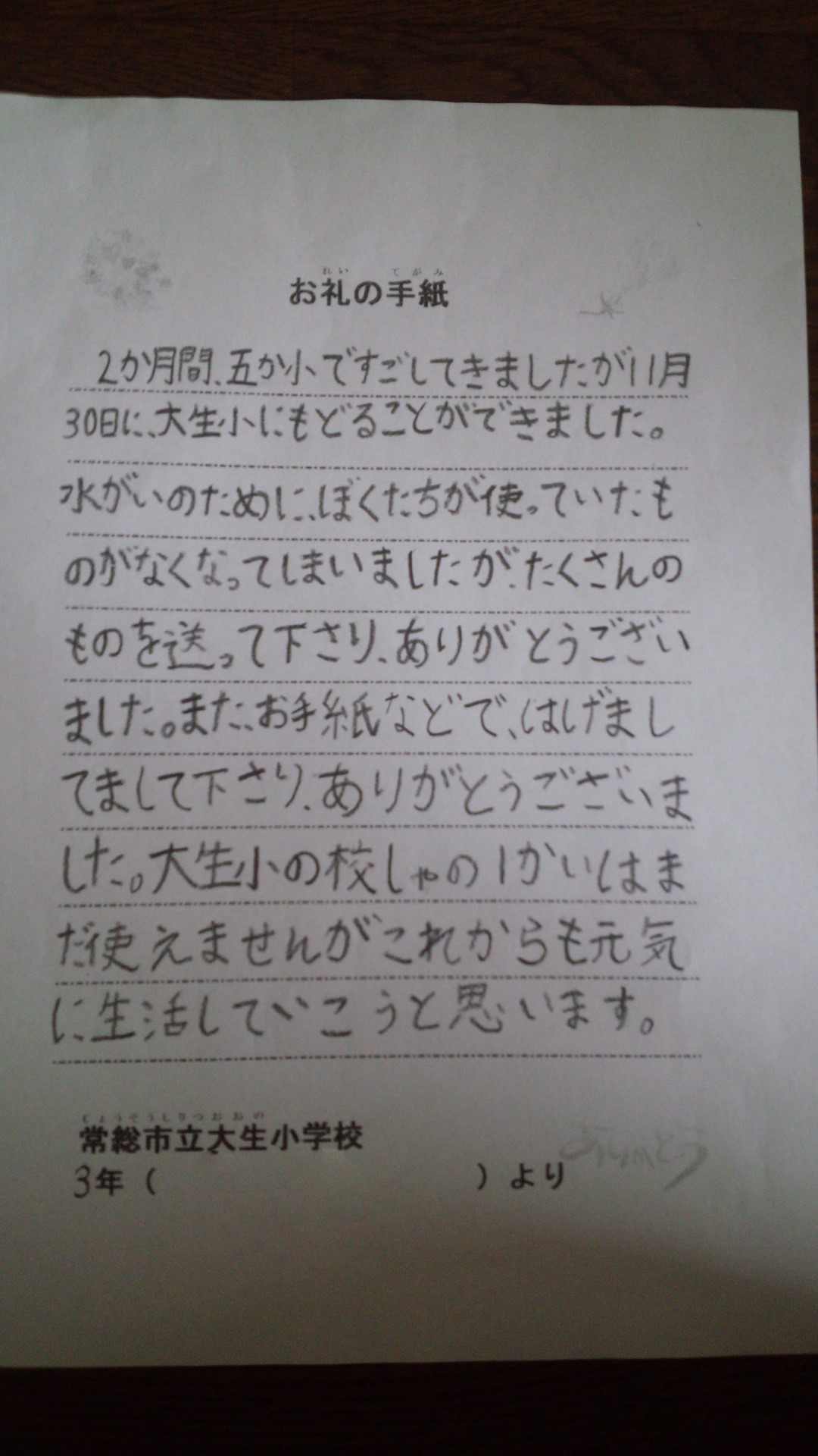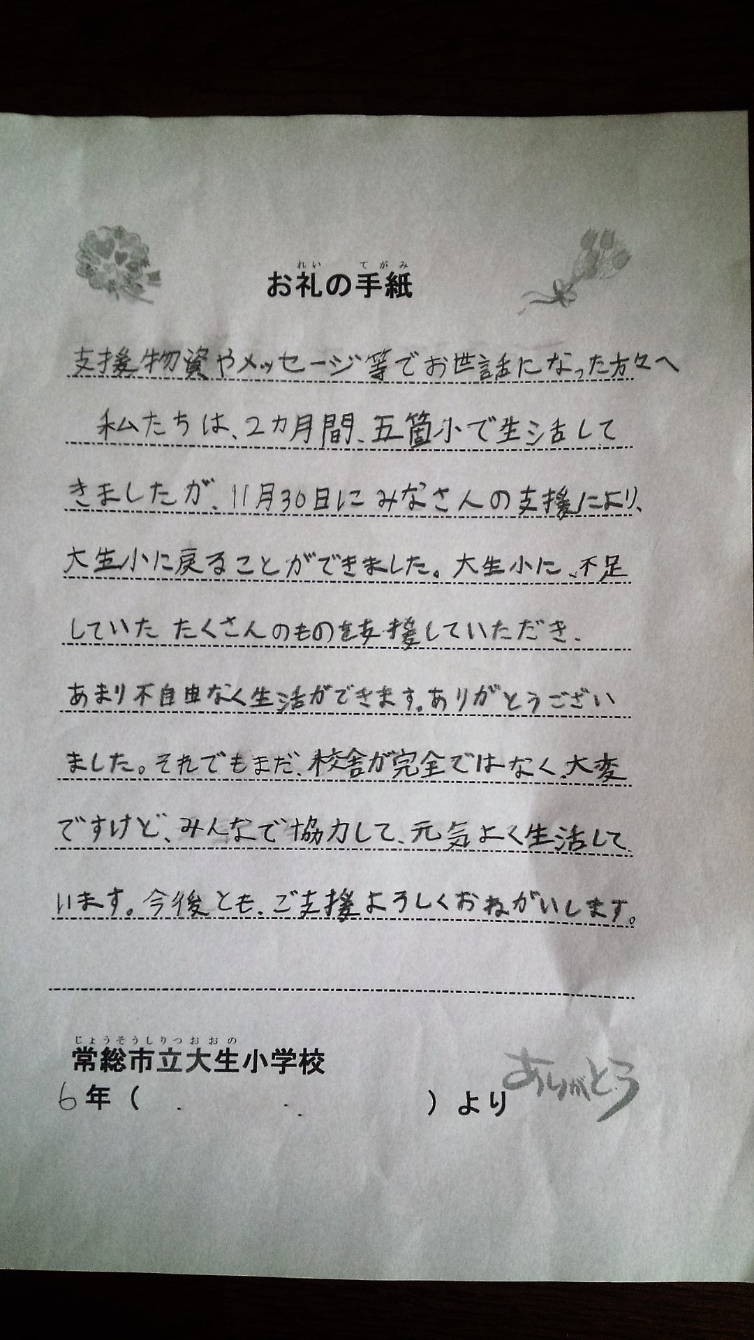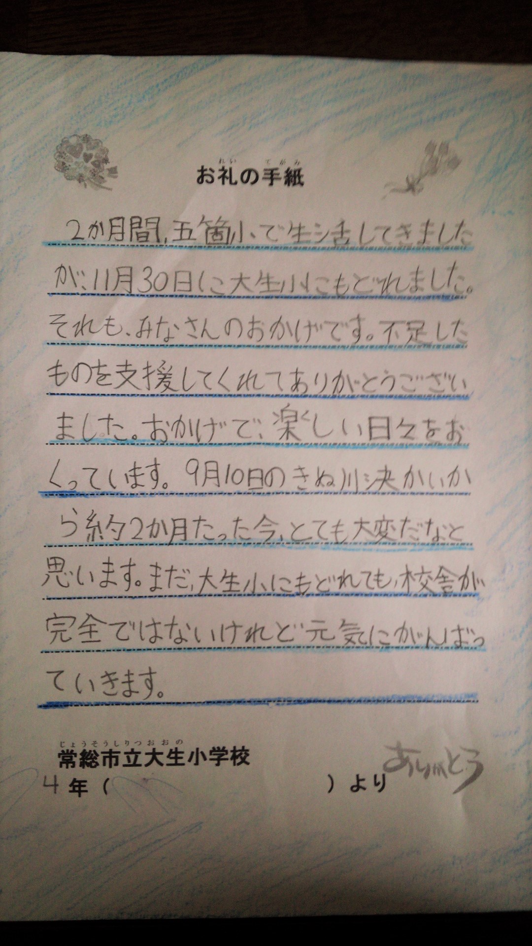 先日、皆さんからいただいた義援金を茨城県常総市立大生小学校へ渡してきましたが、その大生小学校からお礼の手紙が届きました。
